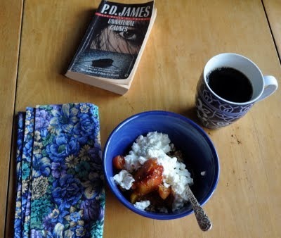 Greek yogurt, sliced South Carolina peaches, and cereal . . . with a side of coffee and mystery.