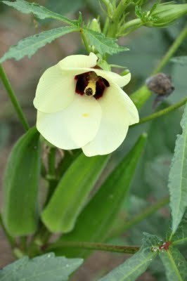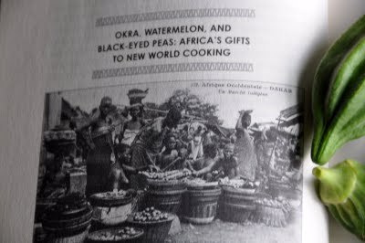 I was thinking about this today when I was in the garden picking some okra. According to Harris, the word okra is from the Igbo language of Nigeria -- where the mucilaginous pods are called okuru. It was grown in the US by the early 1700s and was certainly on the menu at Thomas Jefferson's Monticello.