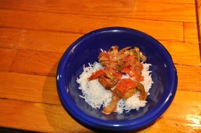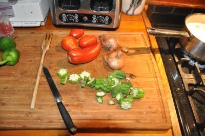I made a simple gumbo with my okra, sauteeing the sliced pods in bacon grease with chopped onion, garlic, and green peppers, then adding chopped tomatoes.