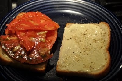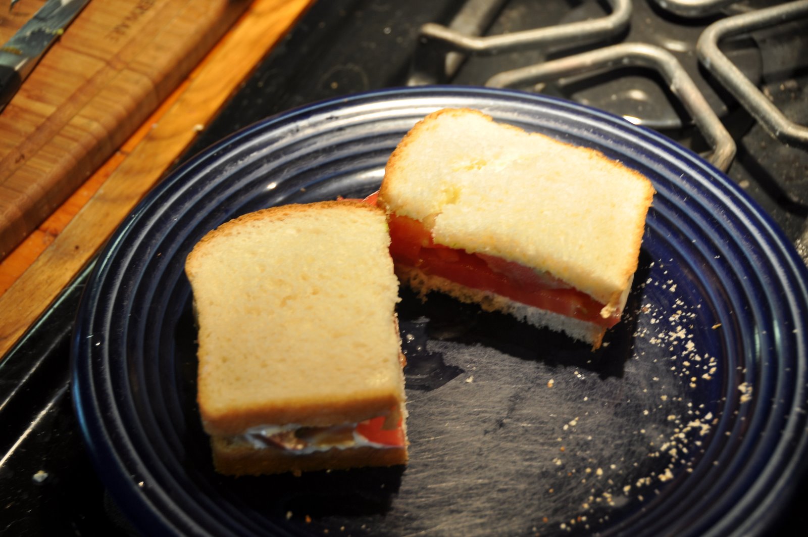 The bread should be sliced white loaf bread. Some swear by Wonder bread or its equivalent. I prefer homemade but in view of the heat, bought some sliced country white from the grocery deli. You want soft bread so the juice of the tomato and the mayo can soak in a bit.