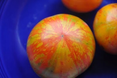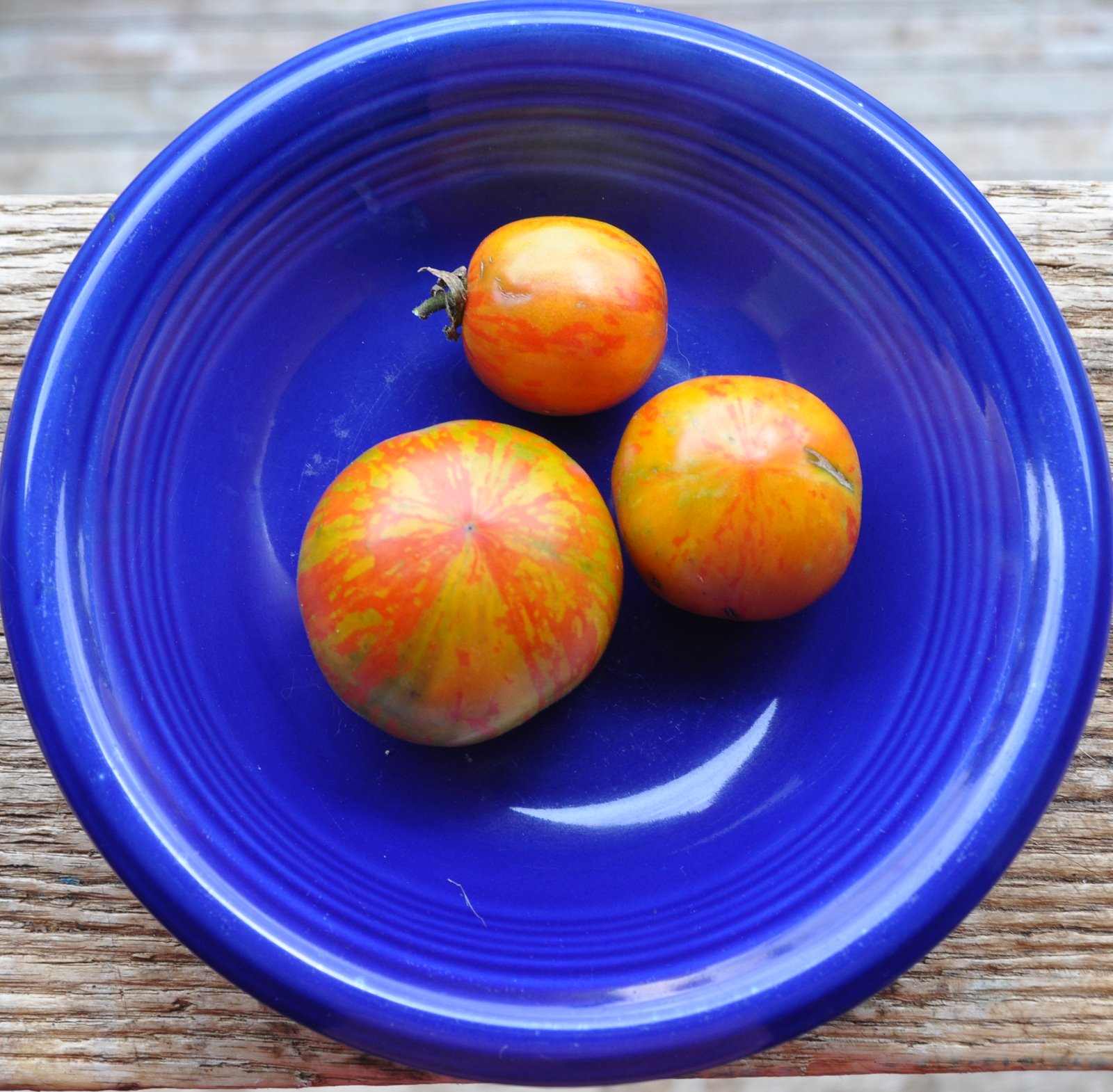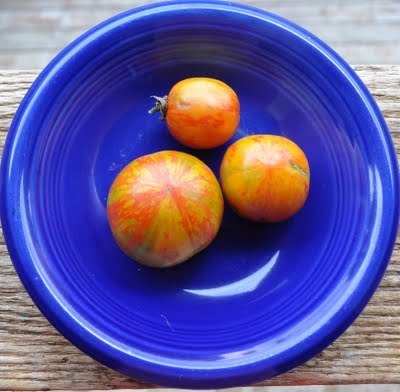 Plum tomatoes -- Romas and San Marzanos have been ripening for several weeks now. And they've found their way into salads and sandwiches where they've been a welcome addition. But really, plum tomatoes are meant for canning or roasting or cooking into sauce. They're not what we call a 'eating tomato.' Now however, the true eating tomatoes are coming in -- Brandywine, Cherokee Purple, Red Zebra . . . I have about twenty of these and some I can't identify. Claui gave me a unlabeled mixed assortment of little plants and I'm enjoying seeing what shows up.
