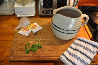 Two giant teabags, about a teaspoon of sugar, and some fresh-picked sprigs of mint go into the pitcher, along with boiling water -- filling the pitcher about two-thirds full. Cover with a folded dishtowel and let brew a while -- 3 to 5 minutes but it's not the end of the world if you forget and come back an hour later.I like the tea to be strong so it can stand up to the ice-- the tiny amount of sugar mellows it out without really making it sweet. Other folks make what they call sweet tea and use a cup or more of sugar -- sweet enough to make your ears ring.