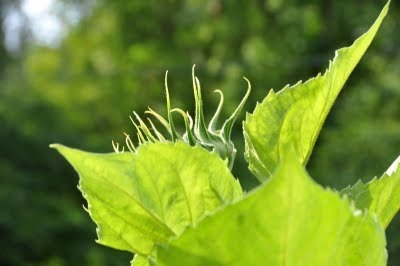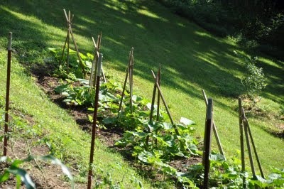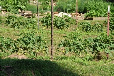 I spent the morning in the garden -- hoeing weeds and suckering and tying up tomatoes. The rest of our yard is badly overgrown with shrubs in need of pruning and rampant with wild grape vines but in the vegetable garden order reigns -- for the moment, at least.