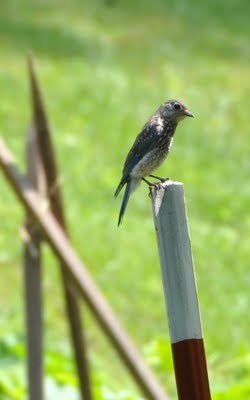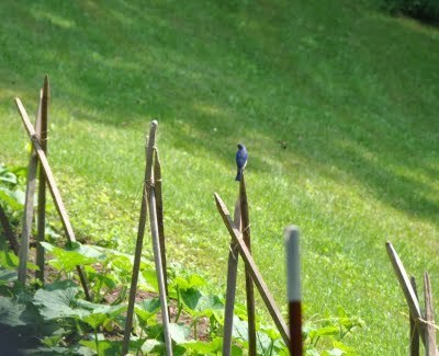 We are fortunate to have several pair of Eastern Bluebirds here on our farm. John has made nest boxes for them and almost every year, they raise several gangs of babies. I was taking a break from hoeing the corn on Tuesday when I saw what seemed to be a bluebird family, introducing the young uns to the world. Bluebirds are voracious bug and worm eaters so I was happy to see the male poised above my winter squash.