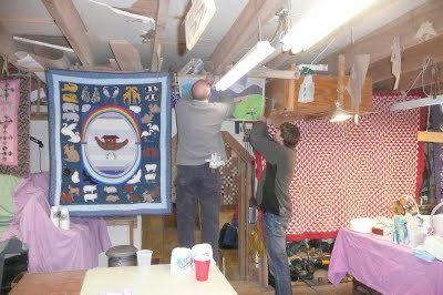 Our friend Bob (the original of Doc Adams in the Elizabeth Goodweather books) always comes over Saturday afternoon to deal with the fiddly job of hanging the quilts.