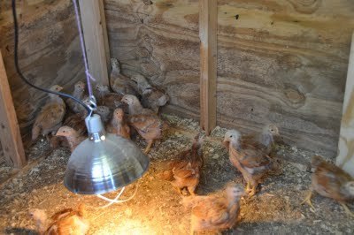 At four weeks old, the broiler chicks are at that awkward age -- part fluff and part feathers. It's cool enough at night that they still need their heat lamp.