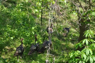 Turkeys wade through greenWeeds wing-high; vines embrace trees...Trees explode in green.