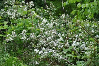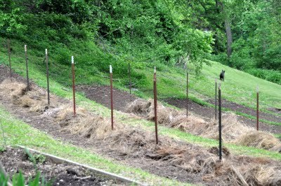 Too much self confidence led me to set out the maters on Tuesday -- before the 'safe ' date of May 15. Then frost and perhaps freezing temperatures were predicted for Wednesday night so John and I covered the plants with hay. Will they survive? This sudden dip in temperatures is called Blackberry Winter -- a cold snap that happens when the blackberries are in bloom. It's obviously common enough to have a name . . . what was I thinking -- defying the gods that way?