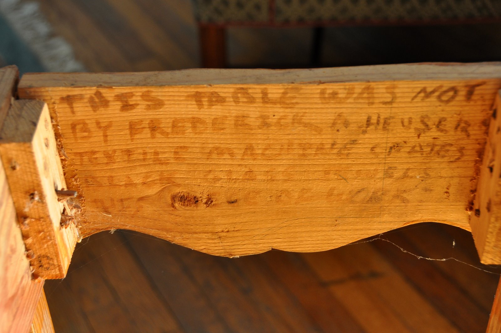THIS TABLE WAS NOT MADE IN A FACTORY ~ IT WAS MADE BY FREDERICK A HEUSER IN ROCK HILL SC (?) FROM SECOND USE PINE TEXTILE MACHINE CRATES ??? THAT HOLD IT TOGETHER ARE ??? BLACK GLASS ?? WALNUT PEGS ???