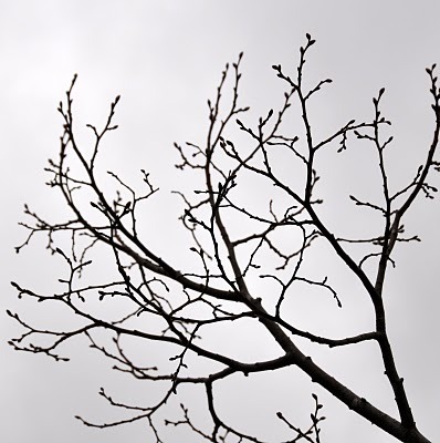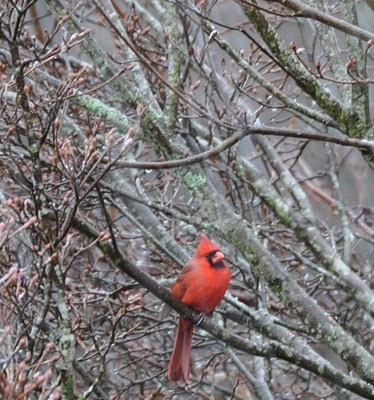 The cardinal is looking disgruntled. Small wonder -- he's sitting in a crab apple tree, surrounding by swelling pink buds, and the rain is turning to snow.