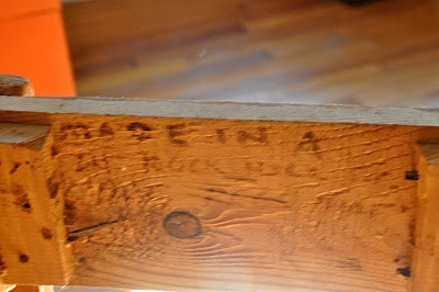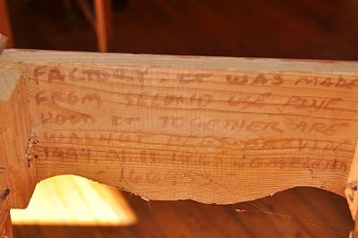 This table is one of my friend Josie's many pieces of folk art that I got a picture of before it was whisked away to California. I find it completely adorable, especially those legs.The top lifts off and on the inside of the apron, its maker has told its story.