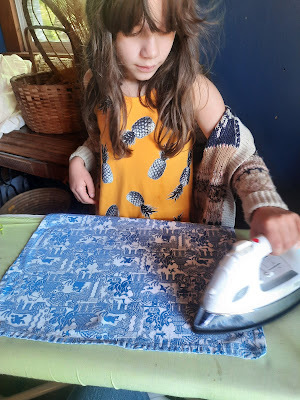 Then it was time to go up to my office (which is also Meema's work room.) I did some stuff while Meema did some ironing. She had four shirts and some napkins to iron. I helped with the napkins and with the shirts too. Shirts are hard. I don't have any clothes that that have to be ironed. My clothes are all nice and soft.