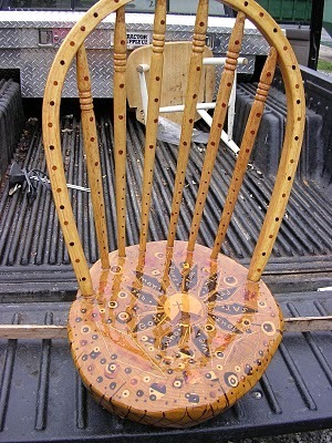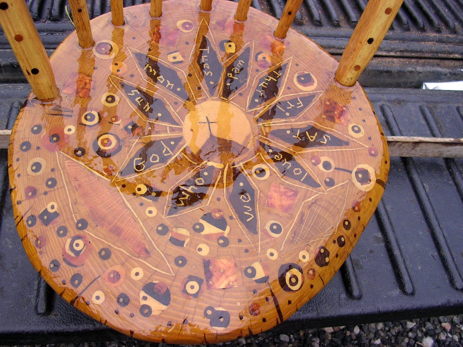 It was several years ago that I was at our dumpster/recycling center and saw this rather amazing bit of folk art in the back of a truck. The fellow who made it told me that he was working on a whole set of them as a gift for his son -- a set of bar stools.I love the use of inlay and the whole cheerful/religious look of this piece.