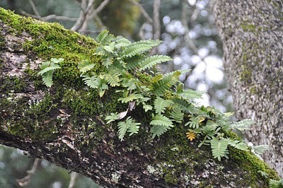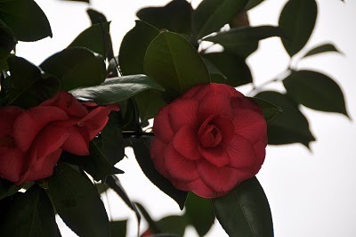 These are my only 'pretty' photos from my trip to Headland -- ferns on a tree in my brother's yard and a pair of camellias on a nearby bush. Rain and cold and overcast conditions kept me inside most of the time.