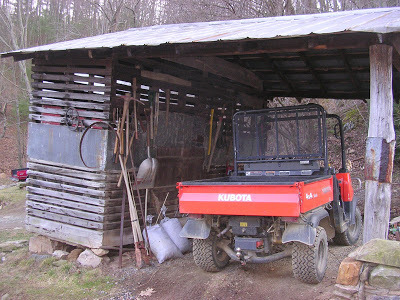 The corncrib was a relic of the days when the previous owner of the farm had grown field corn to feed his cattle, his mules, his chickens, and his family. The corn was harvested after drying on the stalk in the field, and the unshucked ears were stored in the small slat-sided building that was lined with rodent-proof woven wire to protect the precious golden bounty. Nowadays, the corn crib stood empty, but for a few ancient moldy cornshucks. (Art's Blood, p. 123)This, of course, is the original of the corn crib where Elizabeth and Ben found the unhappy Kyra. It's functioning today as a tool shed and a carport for our little utility vehicle but in 1973, when we bought the upper part of the farm from Clifford and Louise, the corn crib brimmed with fat dry ears of white corn -- Hickory King, I think it was.