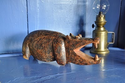 In fact, I love folk art. Primitive, naive, whatever -- pieces that look as if the maker had fun doing them. I only have a few pieces. This charming hippopotamus below was found at a flea market.