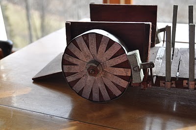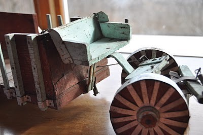 I adore it! The wheels are bound with thin strips of aluminum (probably from a beer can, says my husband) and the same aluminum strips form the mule's harness.
