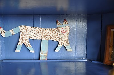 Last of all is this charming cat, a gift from my friend Kathy, the prototype of Sallie Kate the realtor in my books. Kathy got a listing for a house that had belonged to two bachelor brothers. One or perhaps both of them had worked tor the state road department and evidently they had brought home a number of old road signs which they proceeded to turn into folk art. Kathy has a whole array of them which she rescued before the family hauled them off the the dump. I love the cat's smile.