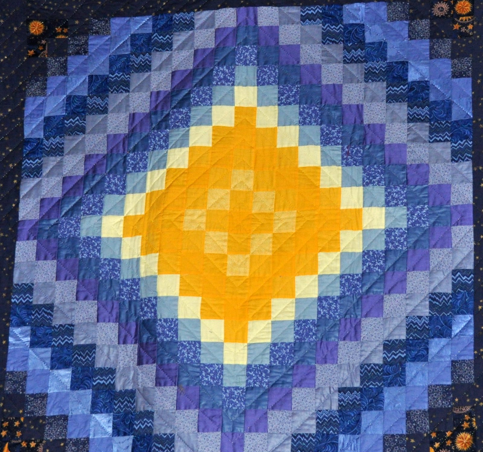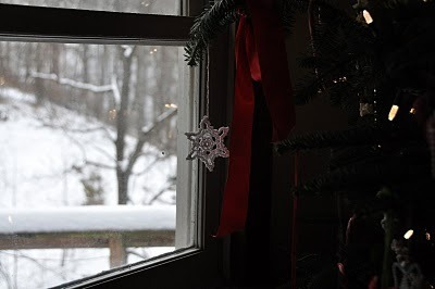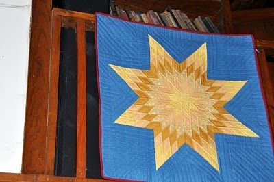 The tree and its lights are gone but we still have tiny white lights around the windows, bookshelf, stairs and mantelpiece. They'll stay up through the dark days of January while the starry quilt adds its own light.