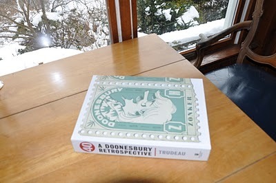The hefty package from my son and daughter-in-law had the clue "interred in the desert sands"on the label. (In the family, we put clues on our gifts to one another and try to guess what's inside before ripping the paper off.)I should have guessed but the size and the weight had me confused. It's a Doonesbury Retrospective and I'm having a great time filling in the years I missed before I discovered that I could begin my day with a fresh Doonesbury on line.