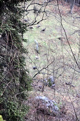 I was happy to catch a glimpse of what must be the same gang of turkeys that we watched grow from poults last year. The two hens are pretty much indistinguishable from their full-grown offspring now. The almost white one is still with them and they seem to ave picked up a few extras -- probably 'jakes' -- young males.