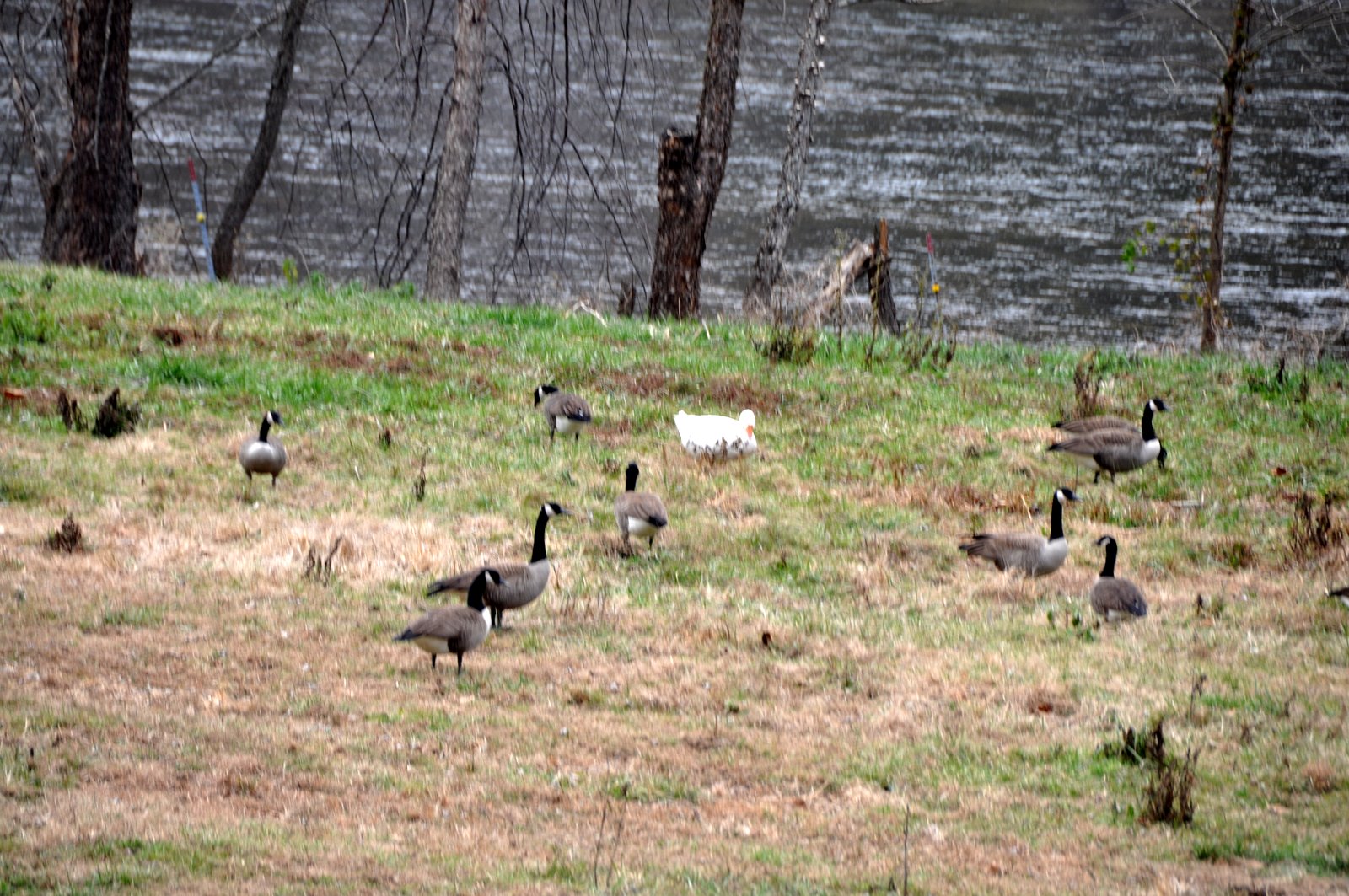 And to wonder about this all white addition to the Canada Goose flock by the river. He or she has been with them for a month or more -- seemingly accepted as a part of the group. Has the interloper found a mate? I can't tell. But I wonder what the others make of it. In the past, the geese have stayed there all winter. I hope they continue to do so because I suspect this domestic bird wouldn't be capable of flying long distances.