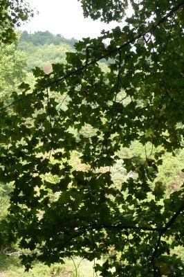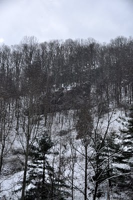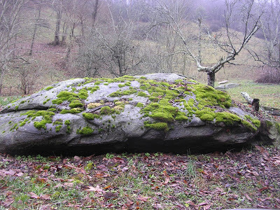 This gorgeous boulder lies at the edge of our orchard and things live under it. Possibly a groundhog or two, maybe some rabbits or there could be snakes. But whenever I see that long dark opening, I think of Little People -- not the Munchkins of Oz but the really little people - Shakespeare's English fairies small enough to use a shed snake-skin as a wrap and his elves who make jackets of bats' wings. Or maybe the Yunwi Tsunsdi.It was the Cherokees who once hunted in this area that told of the Yunwi Tsunsdi - a race of Little People living in caves of rock here in the mountains. Handsome and well-formed, with flowing hair reaching almost to the ground, they were reckoned to be kind, helping lost people and especially children to find the way home. But, the old legends warn, the Little People value their privacy and if any traveler attempts to follow the sounds of their drumming to their dwelling-place, the Little People will cast a spell that will send the wanderer even further astray, turning him around and around and bewildering him forever.