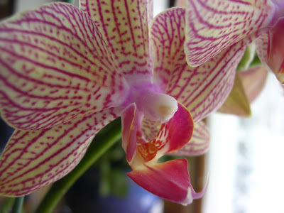 In the case of this odorless orchid, however, I personally would deduce a sense of humor. (are those large insectoid eyes on the white protuberance at the center? Mouse over the picture and click for a close-up of Divine Humor. )