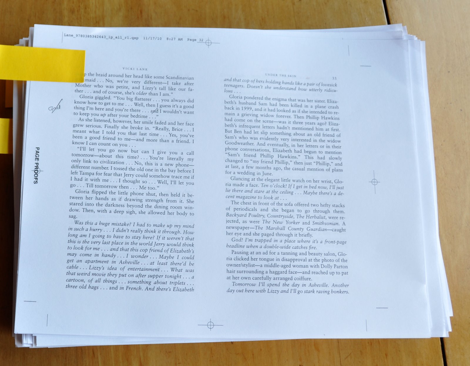 I'm working my way through, trying to read it word by word -- not easy for someone who tends to read very, very fast. Some people swear by reading their proofs backward -- the thought makes my brain hurt, Besides, I'm not just reading for typos and such; I'm making sure it sounds right.So I'm catching a few typos, changing a word here and there -- and now and then saying to myself, 'Dang, this is better than I remembered!'