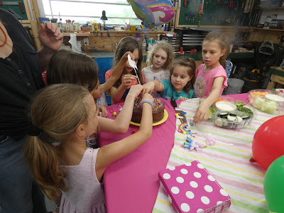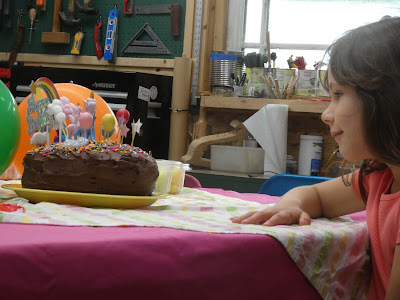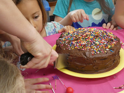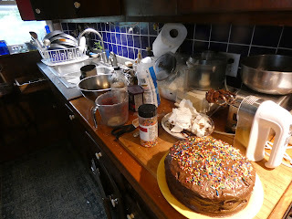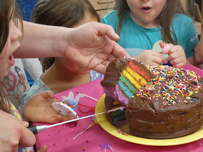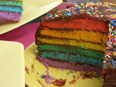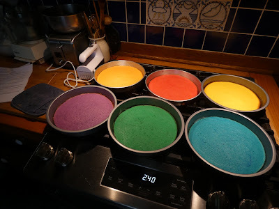 The cake will rest in the refrigerator overnight. I have a whole array of tchotchkes (unicorns, stars, rainbow, clouds) to decorate the top after it makes the trip down to Josie's house tomorrow. There will be pictures.