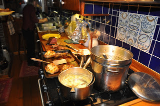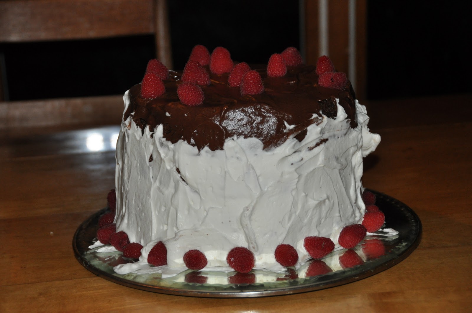 And probably the most decadent cake around -- four chocolate layers with raspberry jam between the layers and chocolate frosting and whipped cream on the outside --we've been celebrating John's birthday!