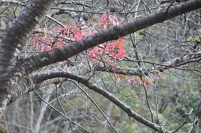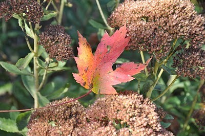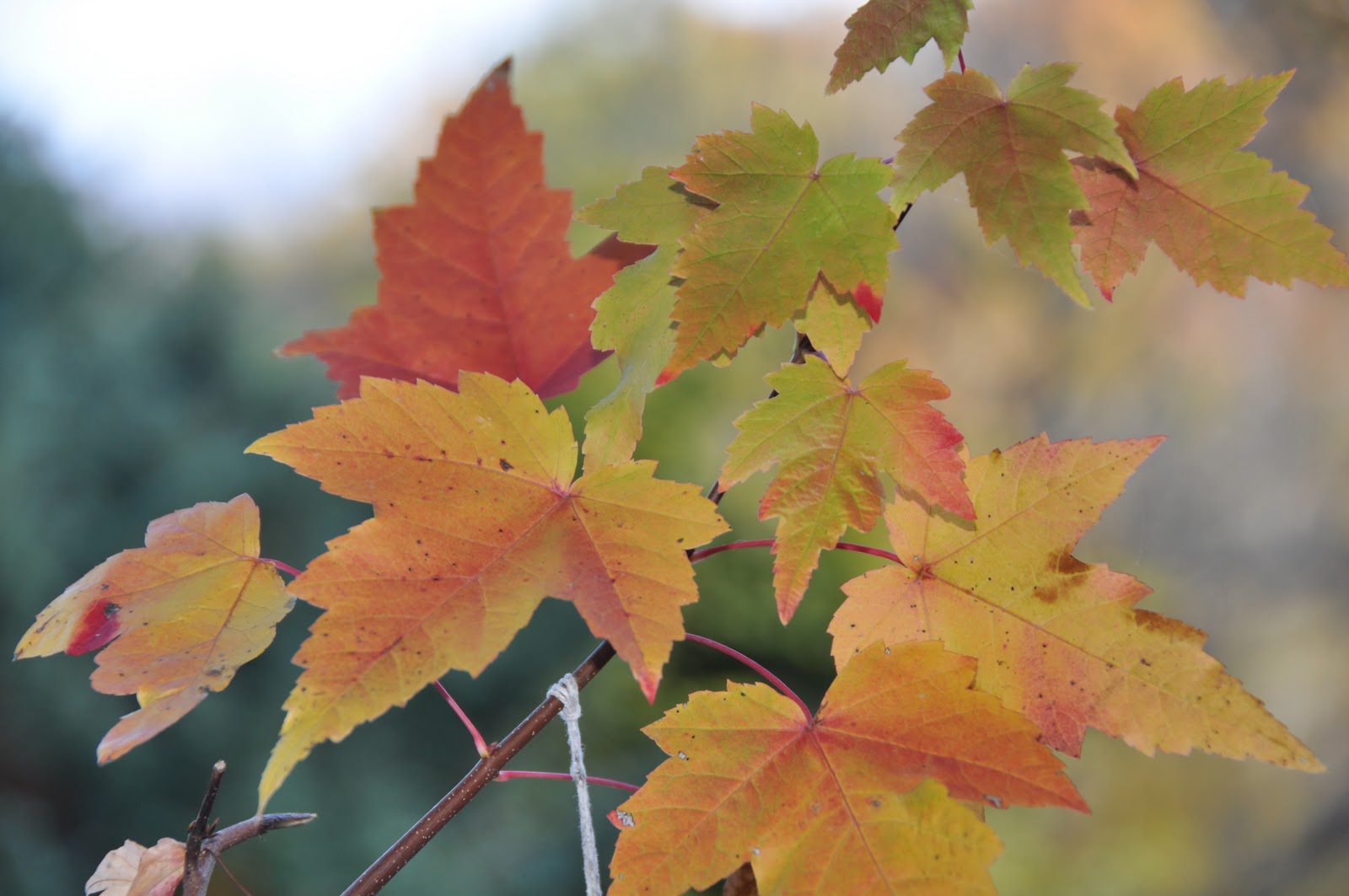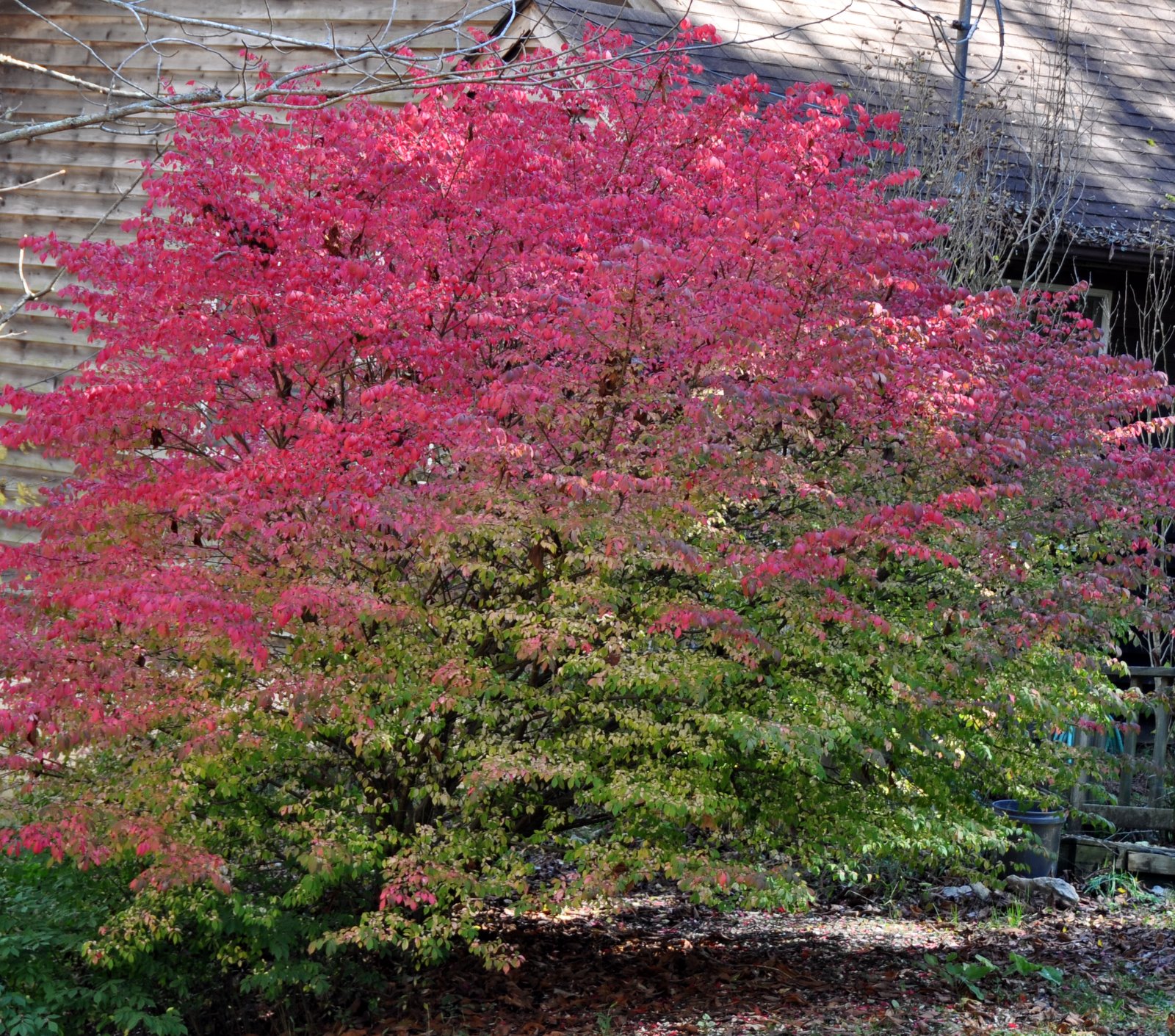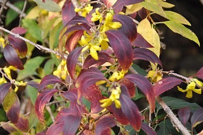 For red and gold, just look at this confused forsythia -- bright yellow spring blossoms and deep red autumn leaves!