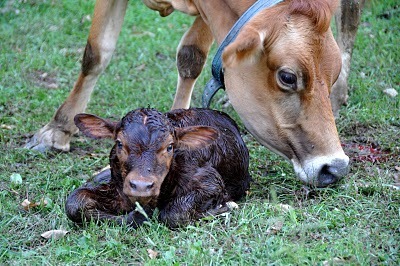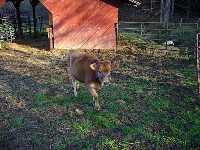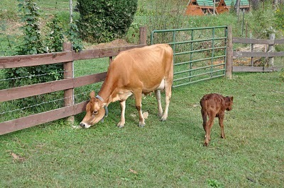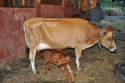 On Tuesday, Marigold the heifer gave birth, thereby becoming a cow! Bubba's a healthy little bull --who looks like his Devon sire.