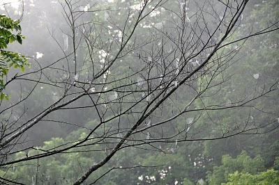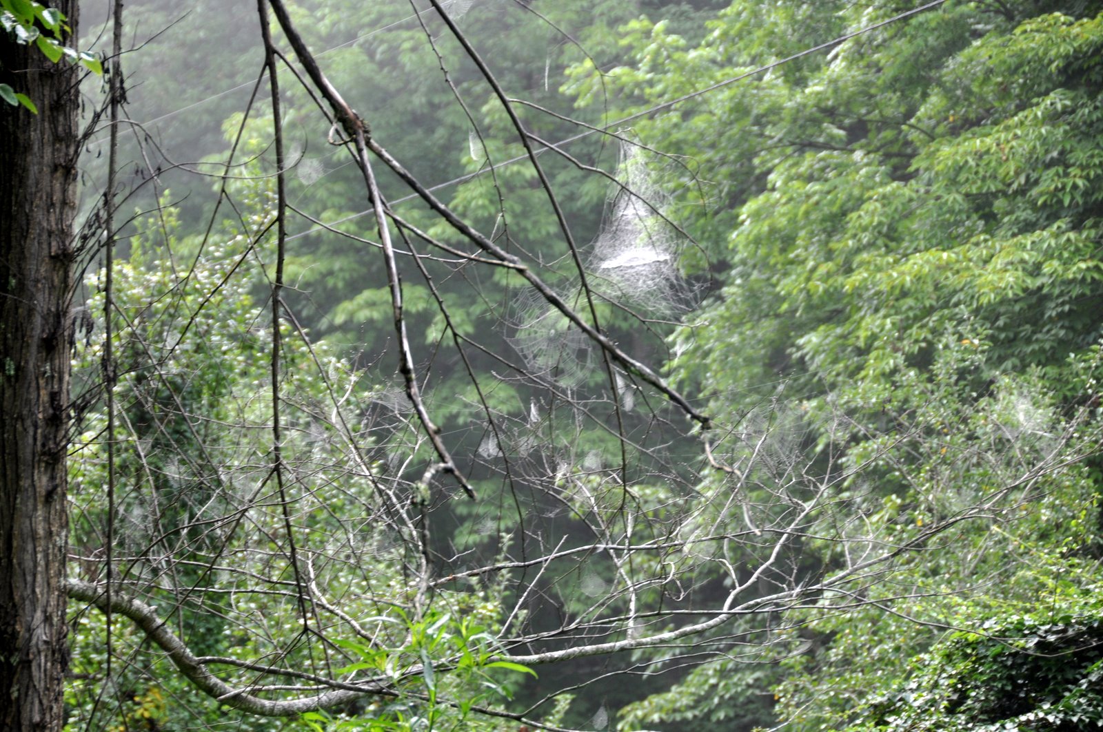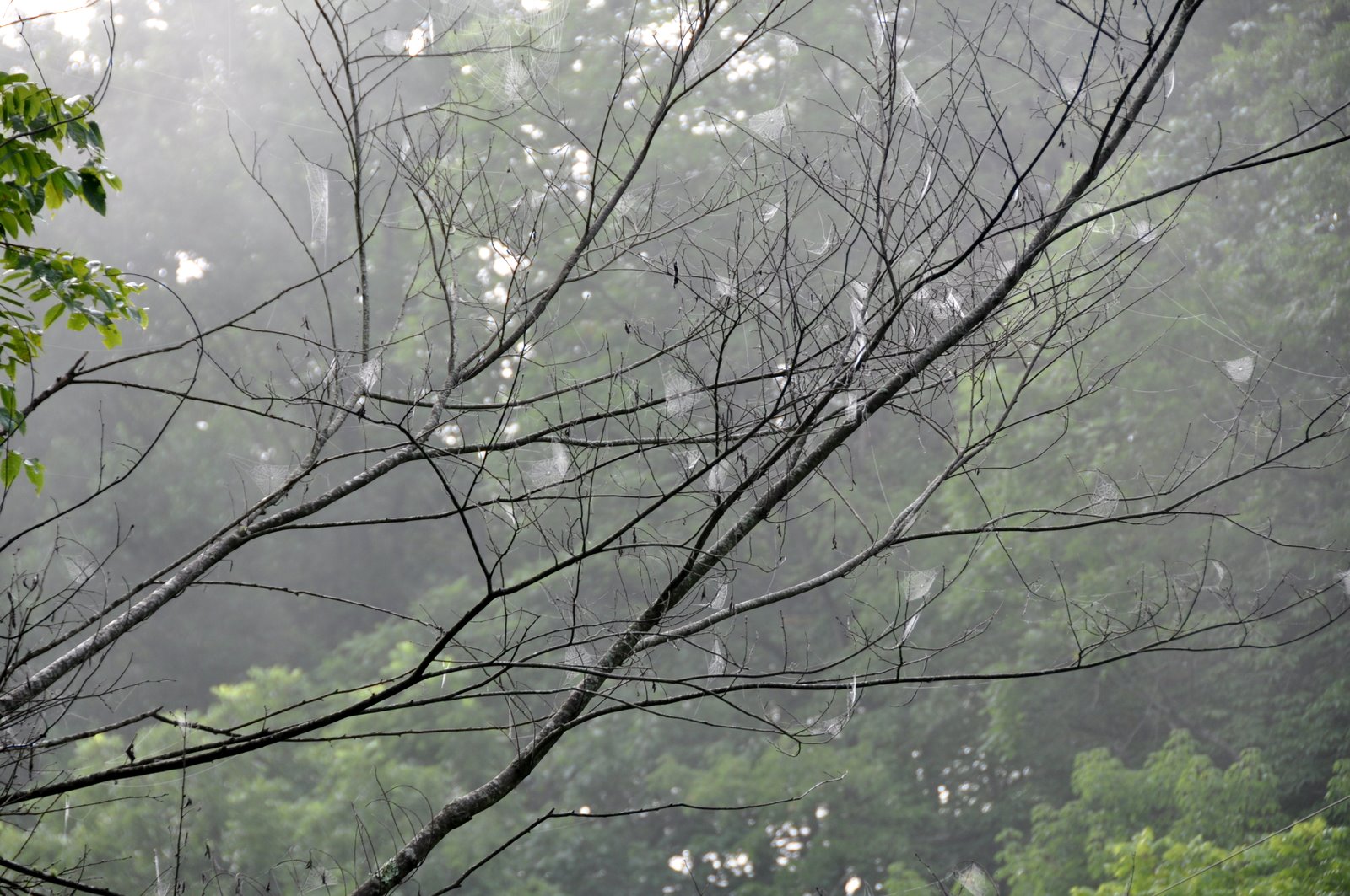 Morning mist reveals a multitude of expectant spiderwebs strung between outstretched twigs and awaiting the catch of the day.