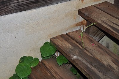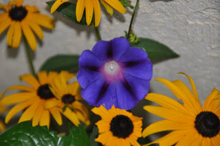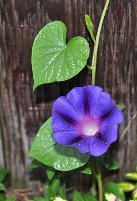 Morning glories are some of my favorite volunteers, climbing up the side of the house to peek in at my coral cupboard and spreading their vines everywhere. They are descended from seeds I planted long ago and sometimes I have to be ruthless if I don't want them overwhelming everything else in a deep blue and green tide.