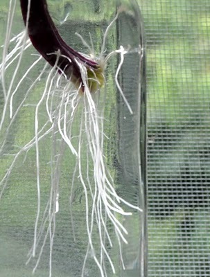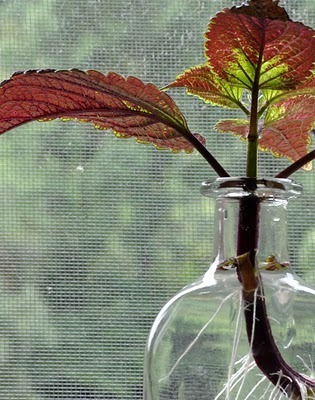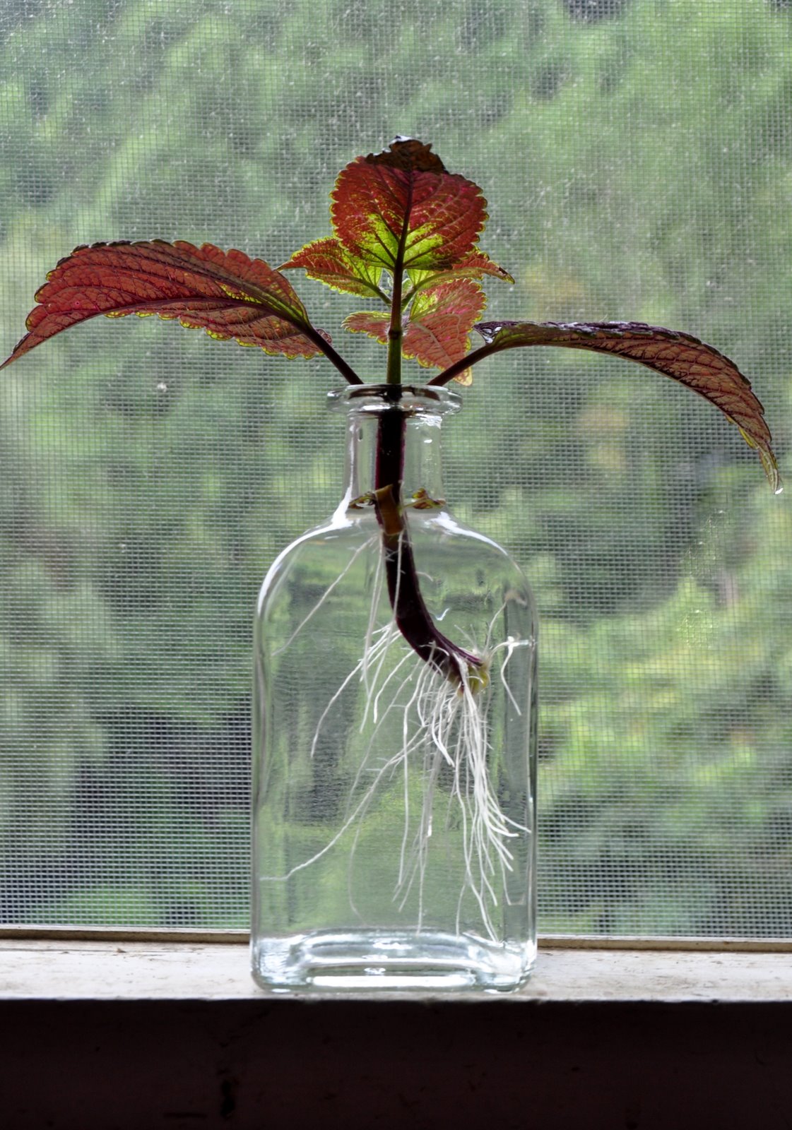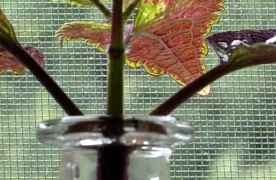 This coleus cutting with its extravagant flowing roots is so pretty that I keep postponing moving it into a pot.