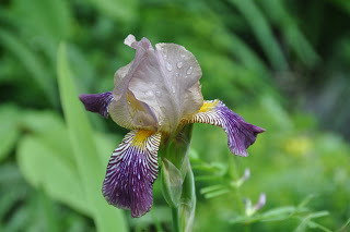 I wish I knew what this odd iris is -- a bearded iris? It has the right form -- the three upright standards and the three falls. But it's much smaller than other bearded irises and has, somehow, a more primitive look to it. Does anyone have a clue?