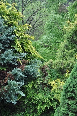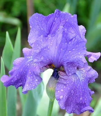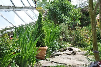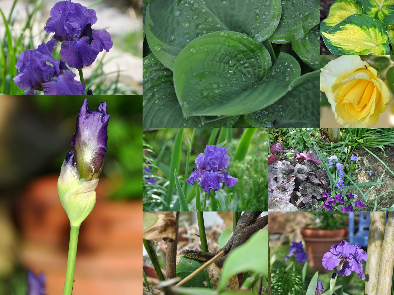 The bearded iris are coming on strong -- such lovely, graceful things. The hostas are lush -- the slugs must not be out yet. The yellow climbing rose by the green house door has its first bloom. . .