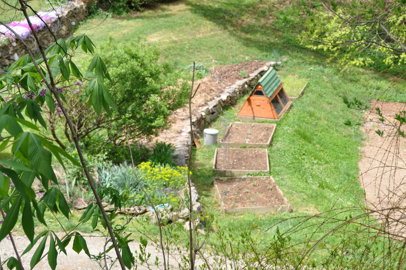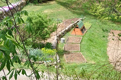 Monday was a perfect day to get out in the garden as rain was forecast for Tuesday. I had a few more potatoes to plant as well as some broccoli and kale and parsley starts to put into my box beds. This row of beds above has benefited from the helpful biddies in the chicken tractor which was carefully constructed by John to fit the beds. The girls eat the weeds and weed seeds and bugs and leave behind a bit of high powered fertilizer.