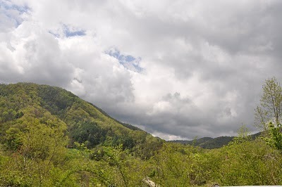 This is one of my favorite color combinations -- purple-grey clouds and and yellow-green foliage.