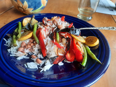 Tonight, it was crowder peas on basmati rice with a bit of thyme and lemon juice, topped with a veggie mélange--yellow squash, onion, red pepper, and green beans (using up veg before going to the store.)