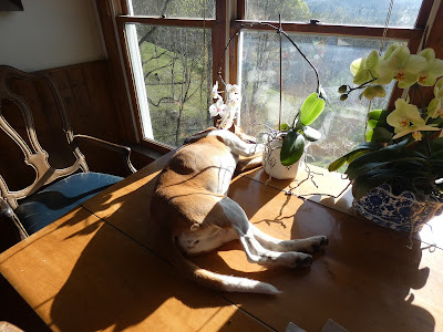 The early morning sky and the weather report promised a cloudy day, and that's what we got. John and I sat out on the porch during totality and noted the drop in temperature, but the light hardly changed, it was so cloudy already. The dogs didn't seem to notice anything unusual.