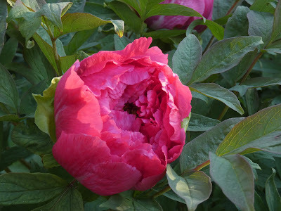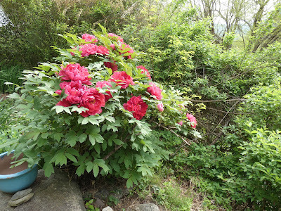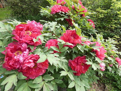 Possibly my favorite flower--at the moment, anyway, the tree peony has outdone herself this year with over 20 blooms.