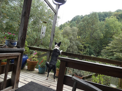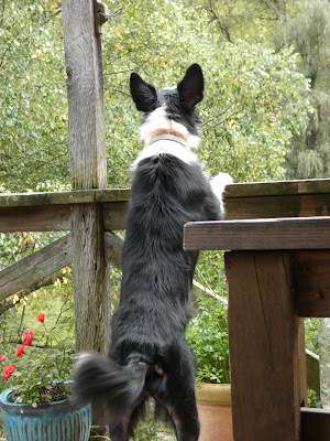 Bailey takes great exception to thunder and stands up against the railing to bark it away.