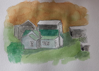 As I mentioned in an earlier post, I've always loved this conglomeration of rooflines at the Boyd place down the road. So finally, I decided to have a go at painting them.