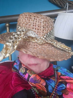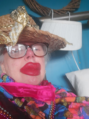 Meema says: The flowered scarf is a half-slip from my trousseau in 1963. The hat was a gift made by m friend Louise long before Josie was around. And the beautiful (wax) lips were a gift from Joy after one of my classes. It pays to have a grandmother who keeps weird stuff around...