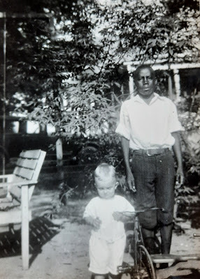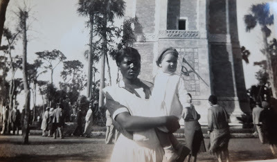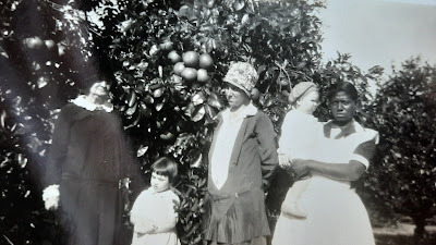 More old photos--I can't identify any of the people. Some white folks touring Florida (possibly one of my great aunts)--at Bok Tower and in an orange grove. Accompanied by a Black woman--who, at that time, would not have been allowed at a tourist attraction except as a uniformed adjunct to a white employer.