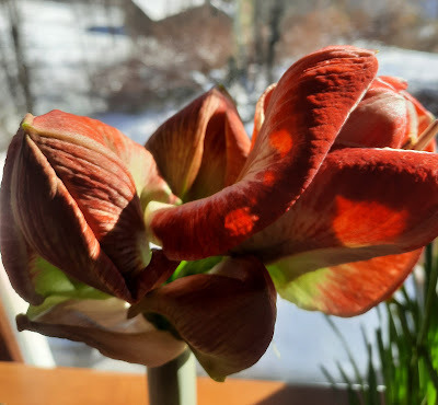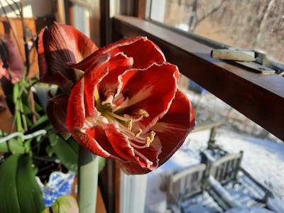 This beauty, a gift from Claui's folks, has been on our dining table since Thanksgiving. This bulb has made two stems and is finally flowering!