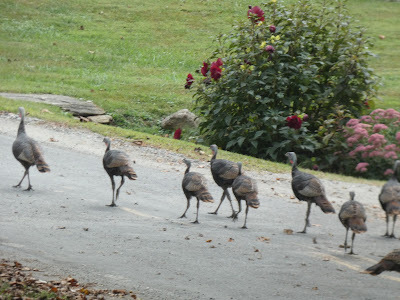 Look at all the young turkeys we saw when Meema was bringing me home from school on Monday! They came from our pasture on their way to our neighbors who feed them.