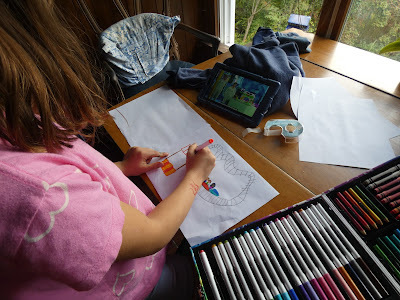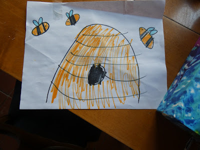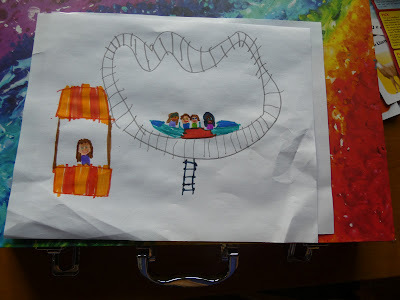 When we got home, I decided to do some art. I did a picture of bees and then I decided to draw a roller coaster with people riding on it. I also drew a hot dog stand but it is not finished so when I went home, I took my art kit with me.